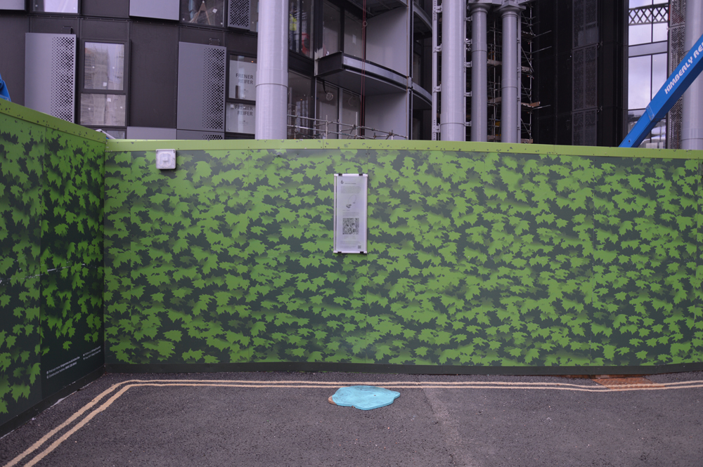 The base plate of the invisible Board - the footprint of King's Cross Development - marked its location next to a building fence, covered with a design of artifical nature, for three days. On the morning of the fourth day, it disappeared - together with the content of the garbage bins, that had been placed there for pick-up.