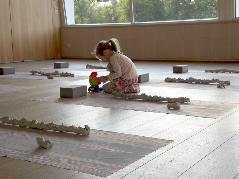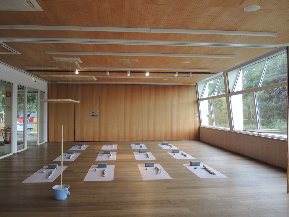 A group of seemingly inert objects and materials are carefully laid out in a large open space. They temporarily make use of a multifunctional social area that is otherwise used quite differently by various bodies. The body of loose parts developed for Beyond Orientation considers the conflation of work and leisure, presents sculpture as a social space of exchange and encounter, and introduces a group of subject-objects as clandestine inhabitants of the exhibition space.